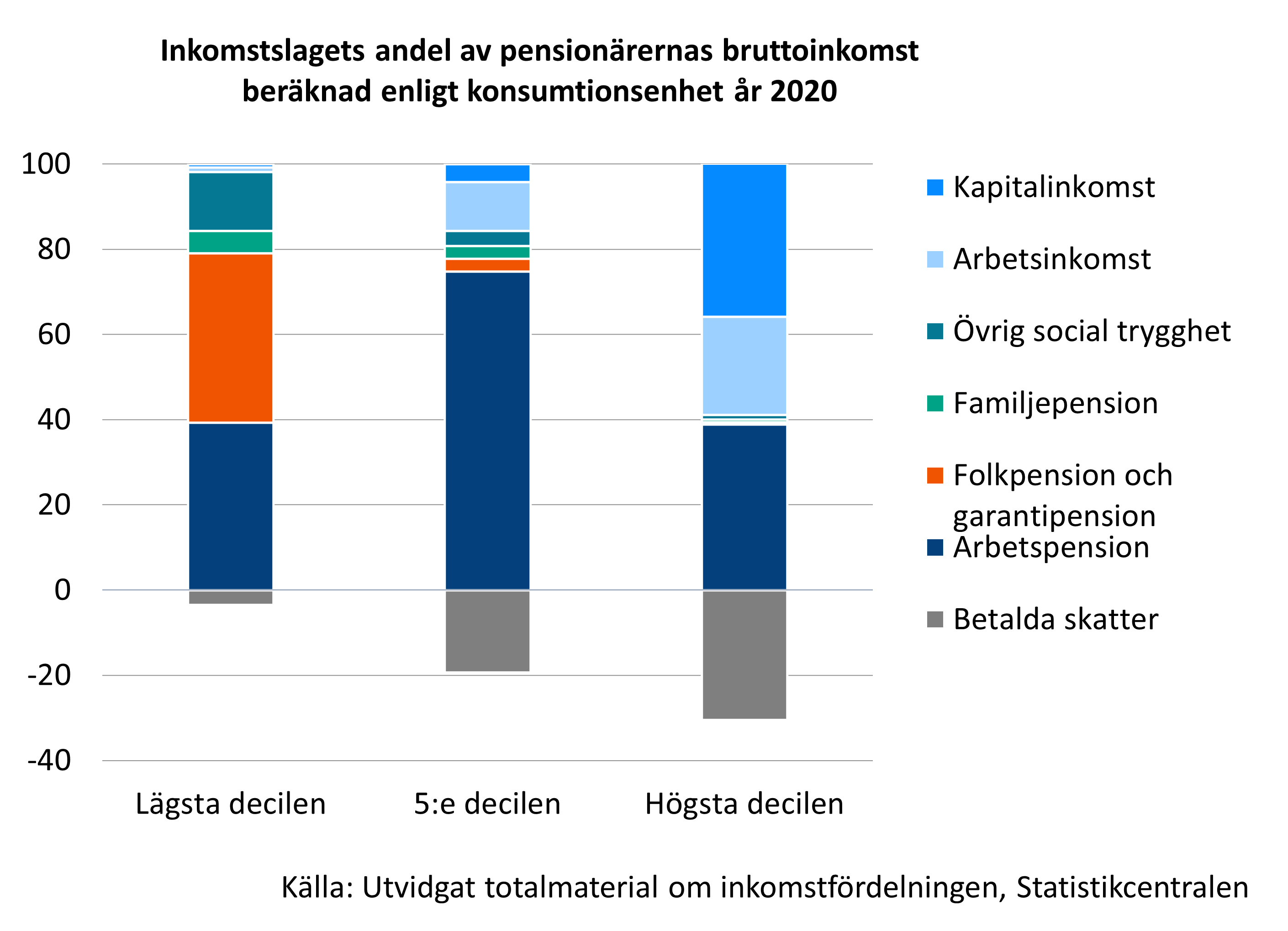 Utöver pensionen har pensionärer också arbetsinkomster, förmögenhetsinkomst och olika bidrag, såsom bostadsbidrag för pensionstagare. I den lägsta inkomstdecilen accentueras inkomster som hör till minimitryggheten, bland medelinkomsttagarna arbetspensionen och i den högsta inkomstdecilen förmögenhetsinkomster och arbetsinkomster.