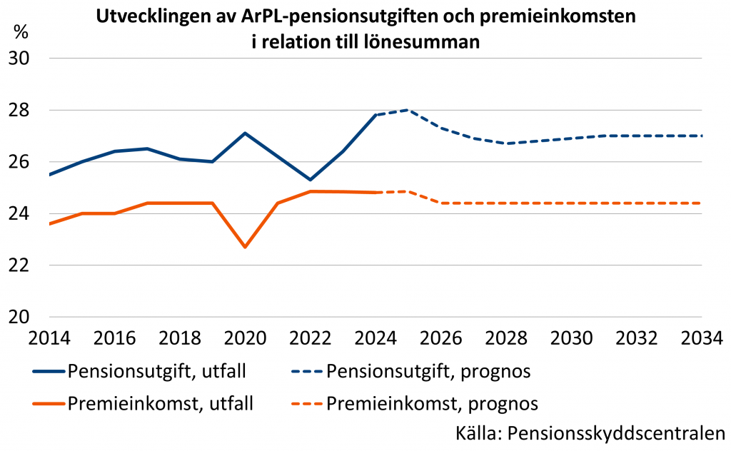 Bilden visar utvecklingen av ArPL-pensionsutgiften och premieinkomsten i relation till lönesumman åren 2014 – 2034.