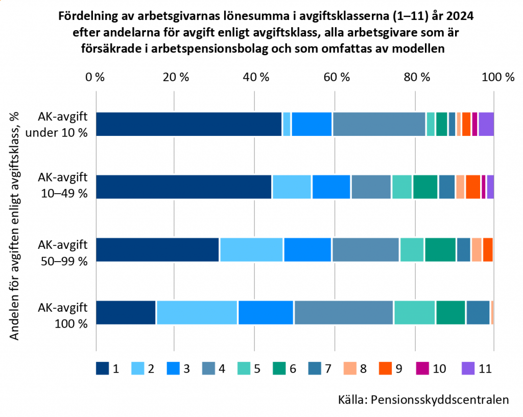 En andel som grundar sig på avgiftsklass finns endast i de avgifter som arbetsgivare med försäkring i arbetspensionsförsäkringsbolag betalar. Invalidpensionsavgiften för ett företag som ordnat pensionsskydd i en pensionsstiftelse eller pensionskassa grundar sig inte på avgiftsklassmodellen. I statistiken har den andel som företagets lönesumma utgör av hela pensionsstiftelsens eller -kassans lönesumma konstgjort definierats som den avgiftsklassbaserade andelen för dessa arbetsgivare.