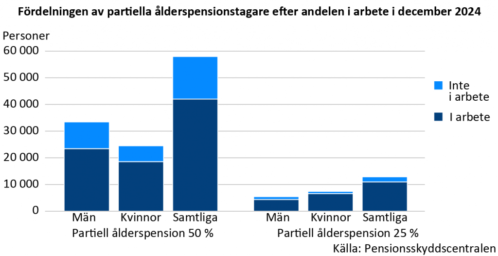 Av dem som fått partiell ålderspension var tre av fyra i arbete vid utgången av år 2024. Största delen av dem som valde en pension på 25 procent fortsatte att arbeta – 86 procent.