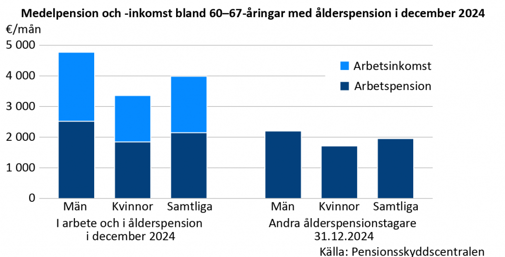 I december 2024 arbetade över 27 000 personer i åldern 60–67 år vid sidan av den egentliga ålderspensionen. Den sammanräknade månadsinkomsten från arbete och ålderspension var i genomsnitt 4 800 euro hos de pensionerade män som arbetade i åldersgruppen. Kvinnornas medelinkomst var något under 3 400 euro. Arbetet nära fördubblade ålderspensionstagarnas månadsinkomster under arbetsmånaderna. Det att de arbetande pensionstagarna i genomsnitt har högre ålderspensioner än andra pensionstagare tyder på att för dem är incitamenten för att arbeta inte främst ekonomiska.