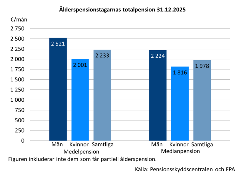 Medianen för totalpensionen för dem som fick ålderspension var 1 978 euro i månaden år 2025. Medianen för månadspensionen var för män 2 224 euro och för kvinnor 1 816 euro.