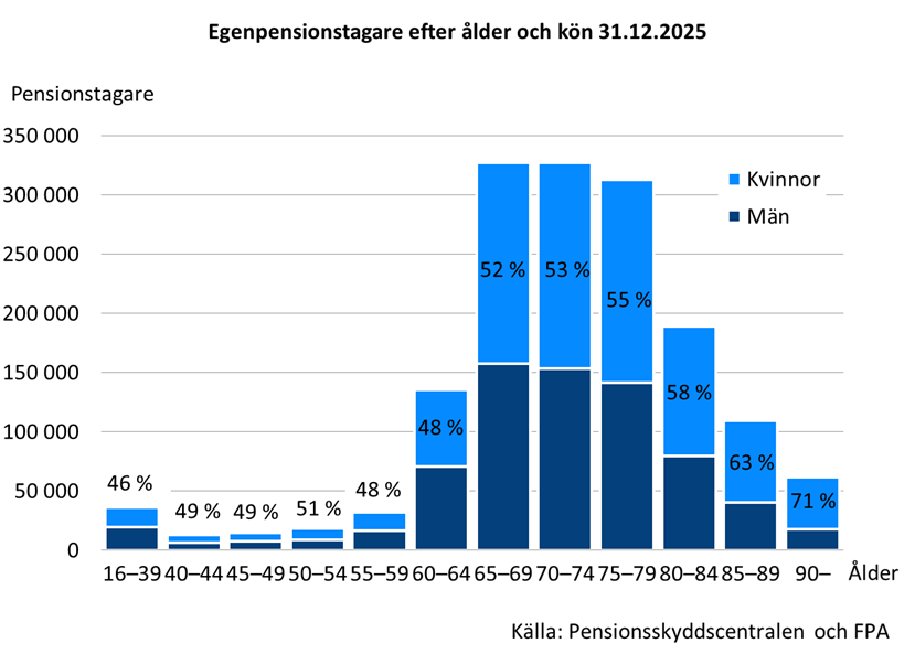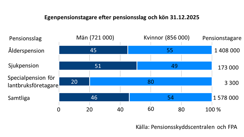 Av de pensionstagare som bor i Finland fick 1 578 000 personer egen pension år 2025. Av dem som fick egen pension var 54 procent kvinnor och 46 procent män. Granskat efter pensionsslag var kvinnornas andel större i alla andra pensionsslag förutom i sjukpensionerna. Av ålderspensionstagarna var 55 procent kvinnor och av dem som fick specialpension för lantbruksföretagare var 80 procent kvinnor. Av sjukpensionstagarna var något fler män (51 %) än kvinnor.