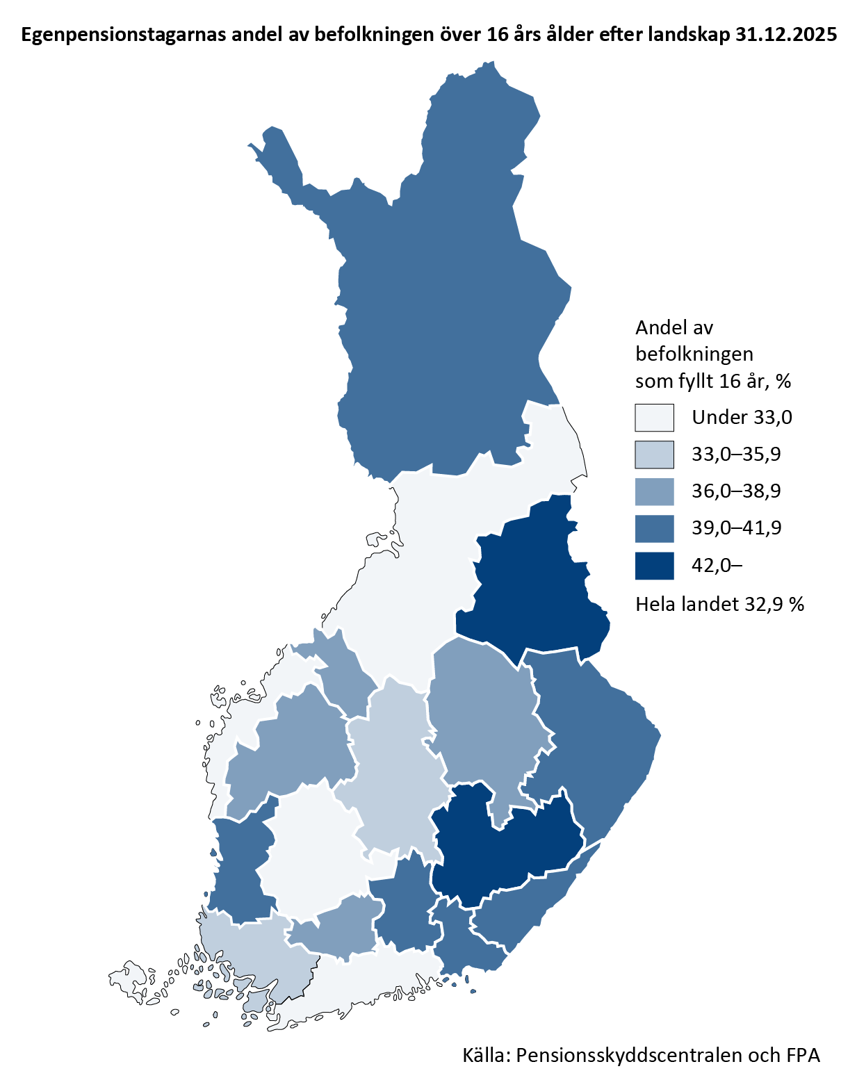 Granskat landskapsvis var andelen med egen pension bland befolkningen över 16 års ålder minst i Nyland med 26 procent år 2025. Näst minst var den i Birkaland (31 %) och på Åland (32 %). Störst var befolkningsandelen pensionstagare i Södra Savolax, 46 procent. Den översteg 40 procent också i Kajanaland (44 %) och i Kymmenedalen (42 %).