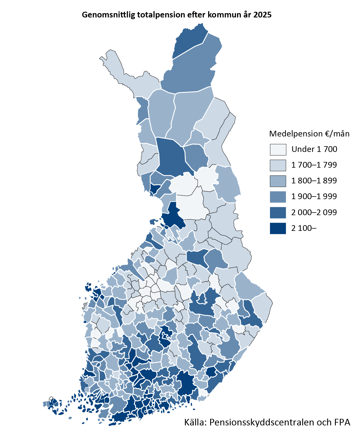 - Pensionstagarnas genomsnittliga totalpension var 2 138 euro i månaden år 2025. Medianpensionen var 1 886 euro i månaden.