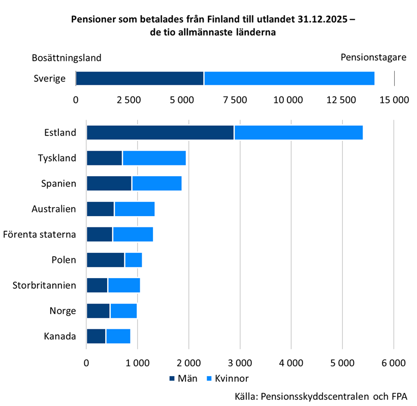 Från Finland betalades pension till över 100 länder år 2025. Av pensionerna betalades 39 procent (14 100) till Sverige. Näst mest pensioner betalades till Estland (5 400), Tyskland (2 000) och Spanien (1 900).