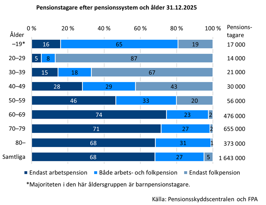 Vid utgången av år 2025 fick nära 90 procent av pensionstagarna i åldern 20–29 år endast folkpension och av 30–39-åringarna över 60 procent. I 40–49-åringarnas åldersgrupp var andelen som fick endast folkpension 43 procent. I den här åldersgruppen fick 29 procent både arbets- och folkpension och 28 procent endast arbetspension.
