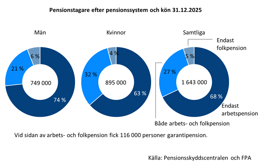 I slutet av 2025 betalades pensioner inom arbets- och folkpensionssystemet till sammanlagt 1 643 000 personer. Av dem bodde 98 procent i Finland. Av Finlands befolkning fick 28 procent någon pension. Av pensionstagarna var 37 000 bosatta utomlands.