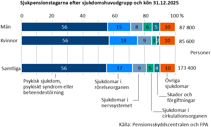 År 2025 var 55 procent av samtliga sjukpensionstagare (97 000 personer) sjukpensionerade på grund av psykisk ohälsa. Andelen för psykisk ohälsa var lika stor hos både män och kvinnor.