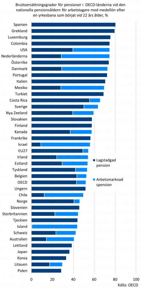 De högsta bruttoersättningsgraderna har arbetsagare med medellön, ca 80 procent, i Grekland och Spanien. I Polen är ersättningsgraden lite under 30 procent och lägst bland länderna i jämförelsen. I Finland är ersättningsgraden över medelnivån i OECD-länderna. I kalkylerna ingår både lagstadgade pensioner och arbetsmarknadspensioner.