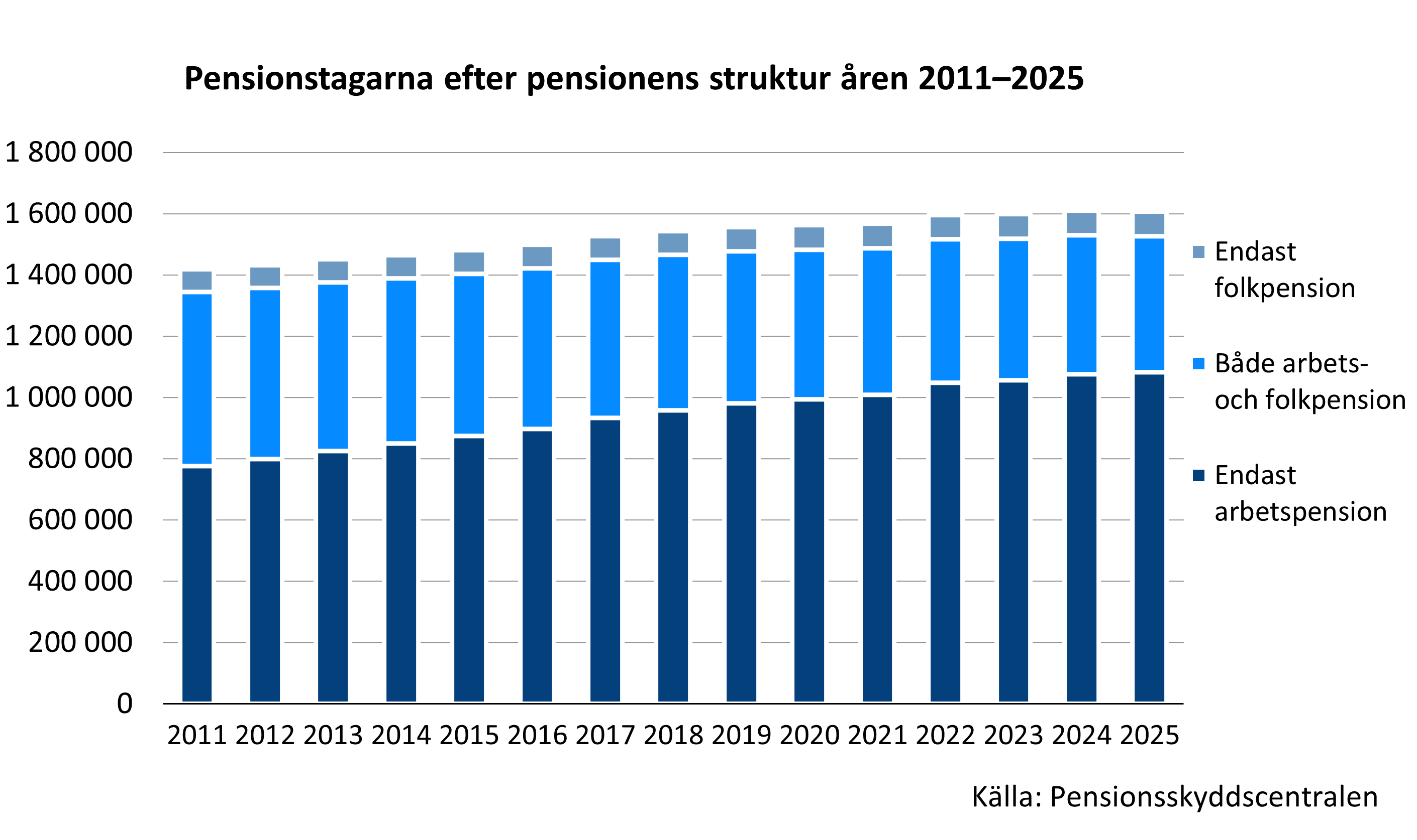 Pension från både folkpensions- och arbetspensionssystemet betalades till 27 procent och enbart folkpension till fem procent av pensionstagarna. I slutet av år 2025 var antalet samtliga pensionstagare bosatta i Finland ca 1 607 000. Antalet egenpensiostagare (inte familjepension) var 1 578 000.