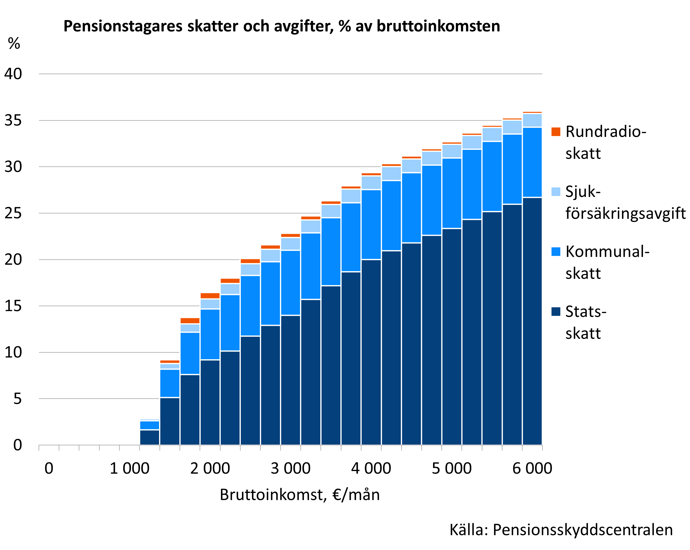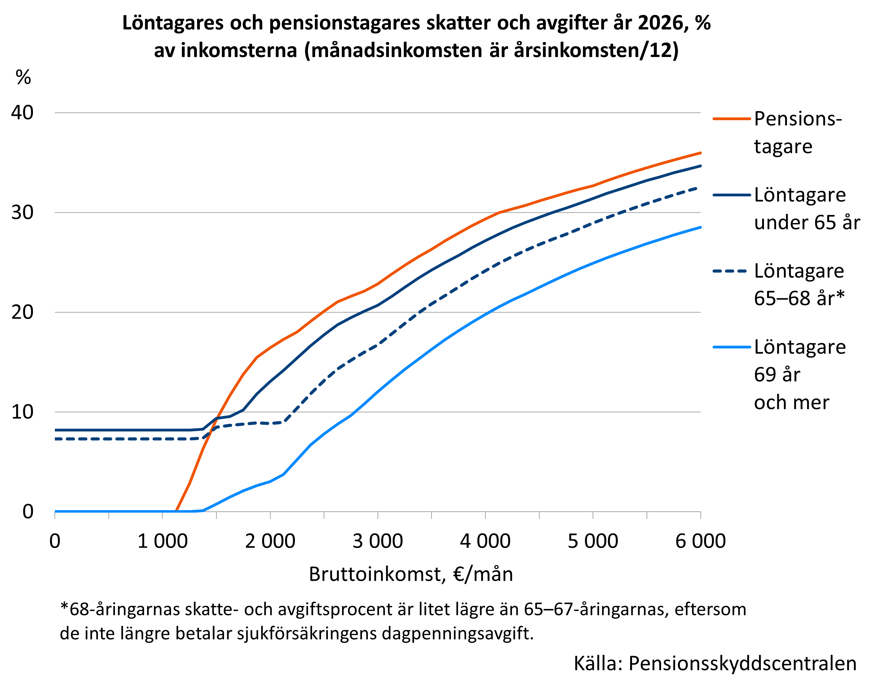 I bilden nedan jämförs löntagares och pensionstagares skatte- och avgiftsbelastning år 2026 på olika inkomstnivåer (månadsinkomsten är årsinkomsten/12). Löntagarnas totala avgiftsprocent är olika i olika åldrar, eftersom arbetstagaravgifterna ändras med åldern. De som fyllt 69 år betalar inte längre arbetstagaravgifter. Åldern påverkar löntagarnas beskattning också genom arbetsinkomstavdraget, eftersom de som fyllt 65 får avdraget förhöjt. På inkomster från ca 1 500 euro uppåt är pensionstagarnas skatte- och avgiftsbelastning ett par procentenheter högre än för löntagare under 65 år. Som störst är skillnaden vid 1 800 euro i månadsinkomst, då den uppgår till cirka 3,5 procentenheter. När inkomsterna överstiger 5 000 euro är skillnaden cirka en procentenhet.