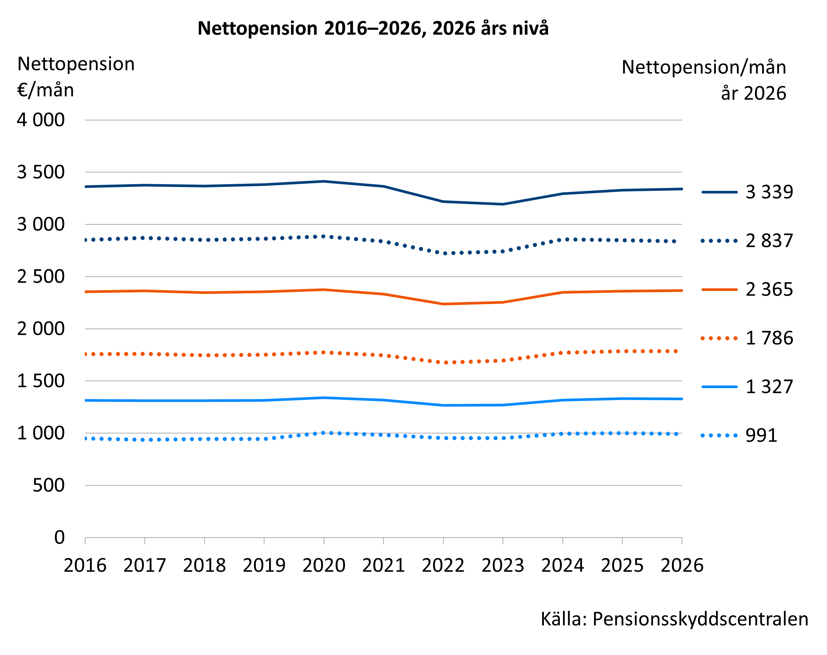 Hur stor nettopensionen blir beror på hur arbetspensionen, folkpensionsförmånerna och beskattningen bestäms. De spelar var sin roll. Arbetspensionerna höjdes enligt arbetspensionsindex med 0,9 procent i början av år 2026. Folkpensionen och garantipensionen höjdes enligt folkpensionsindex med 0,5 procent. Indexjusteringarna av bostadsbidrag för pensionstagare har frysts för åren 2024–2027.