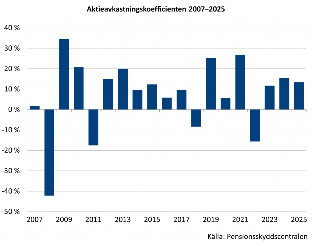 Aktieavkastningskoefficienten bestäms enligt den vägda genomsnittliga avkastningen minus en procentenhet på ArPL-pensionsanstalternas och Sjömanspensionskassans aktieplaceringar som är föremål för handel på en reglerad marknad i utvecklade stater.