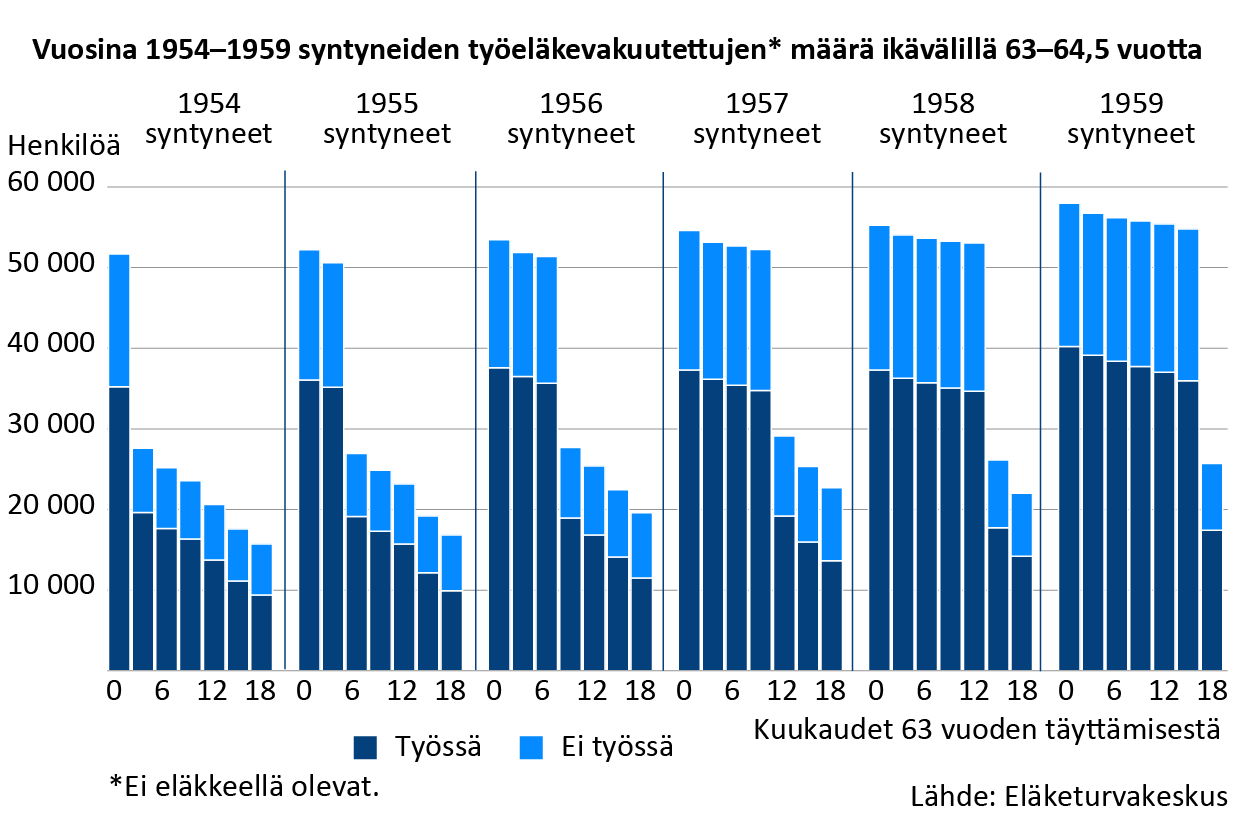 Vanhuuseläkkeen alaikärajan nostaminen on toiminut tavoitteiden mukaisesti. Eläkkeelle siirtyminen on myöhentynyt samassa tahdissa vanhuuseläkkeen alaikärajan nousun kanssa. Kun lisäksi työssä olevien osuus on pysynyt likimain ennallaan uuteen eläkeikään saakka, työnteko 63 vuoden iän täyttämisen jälkeen on lisääntynyt merkittävästi.