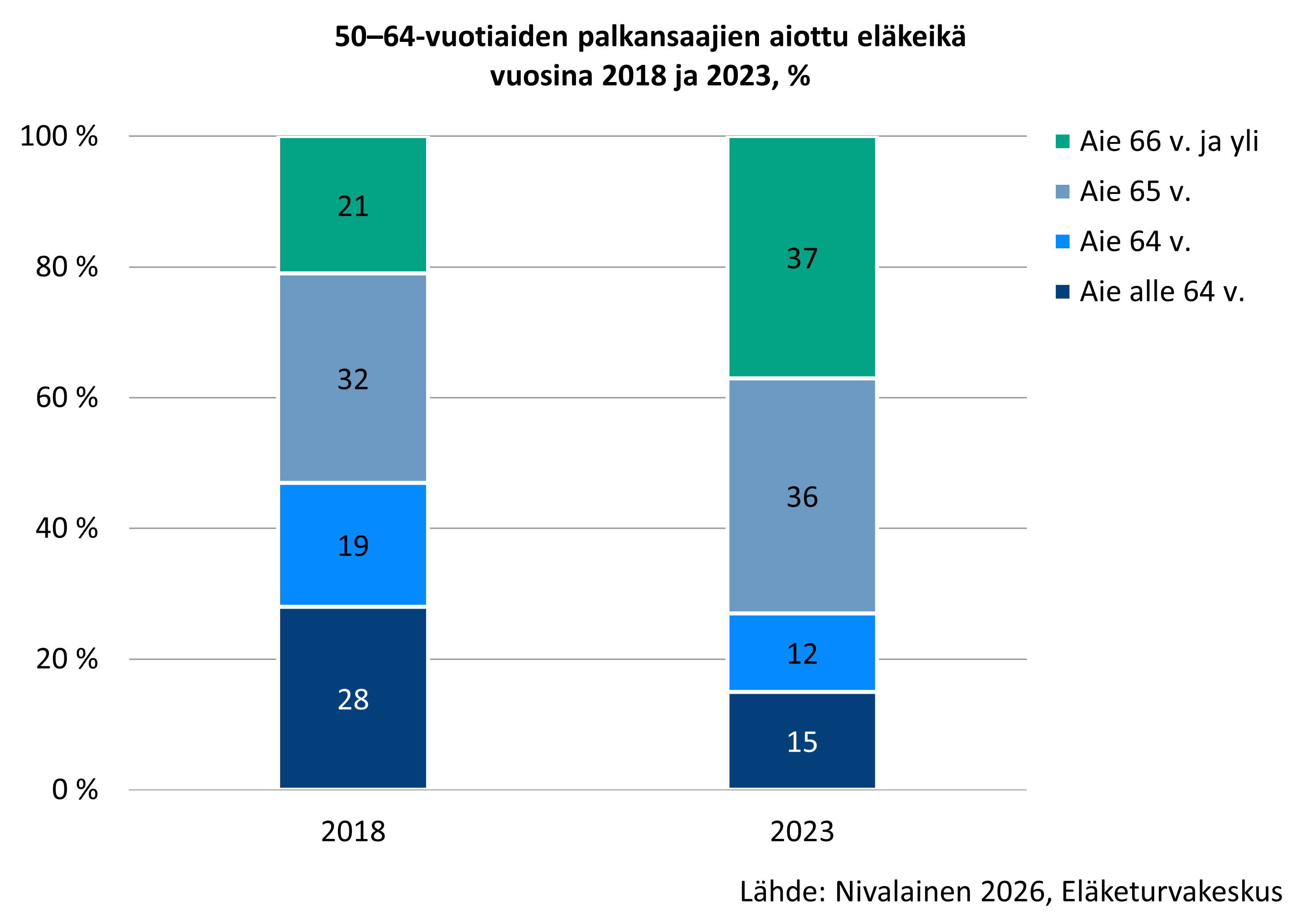 Vuonna 2023 lähes 40 prosenttia 50–64-vuotiaista palkansaajista aikoi jäädä eläkkeelle vasta 66-vuotiaana tai vanhempana. Vielä vuonna 2018 vastaava osuus oli vain 20 prosenttia.